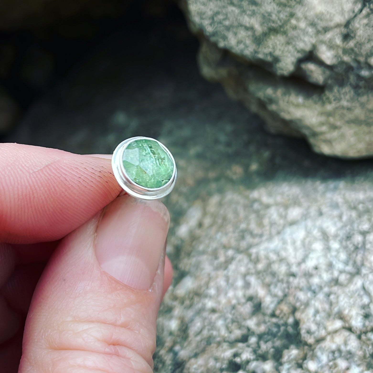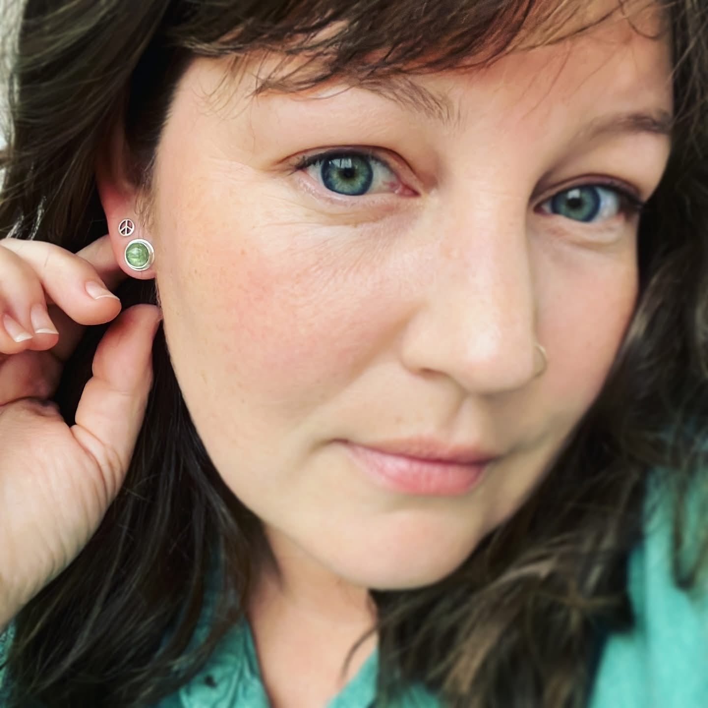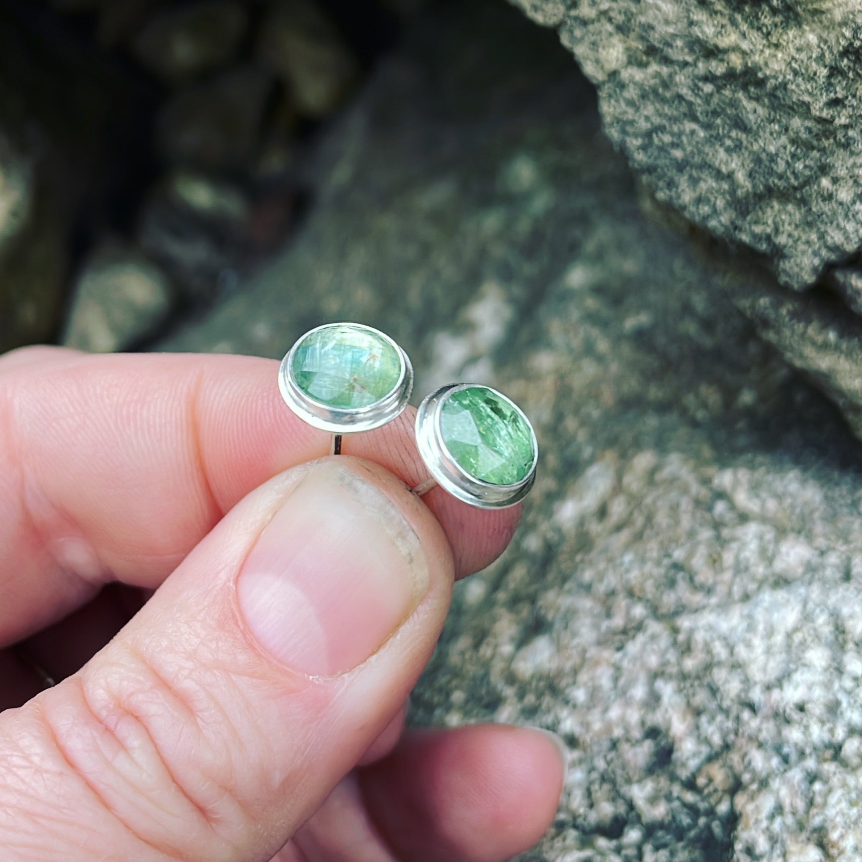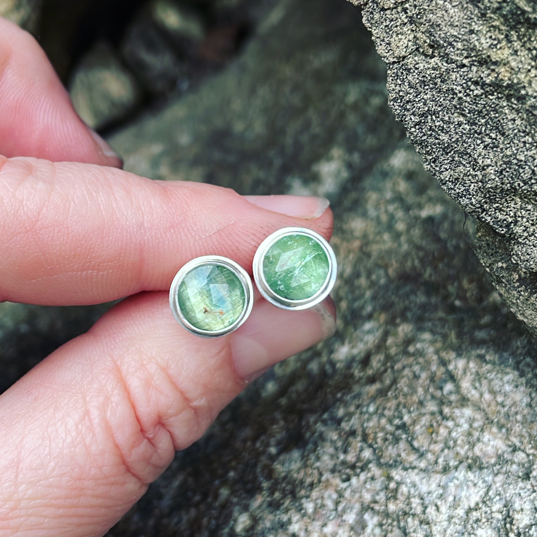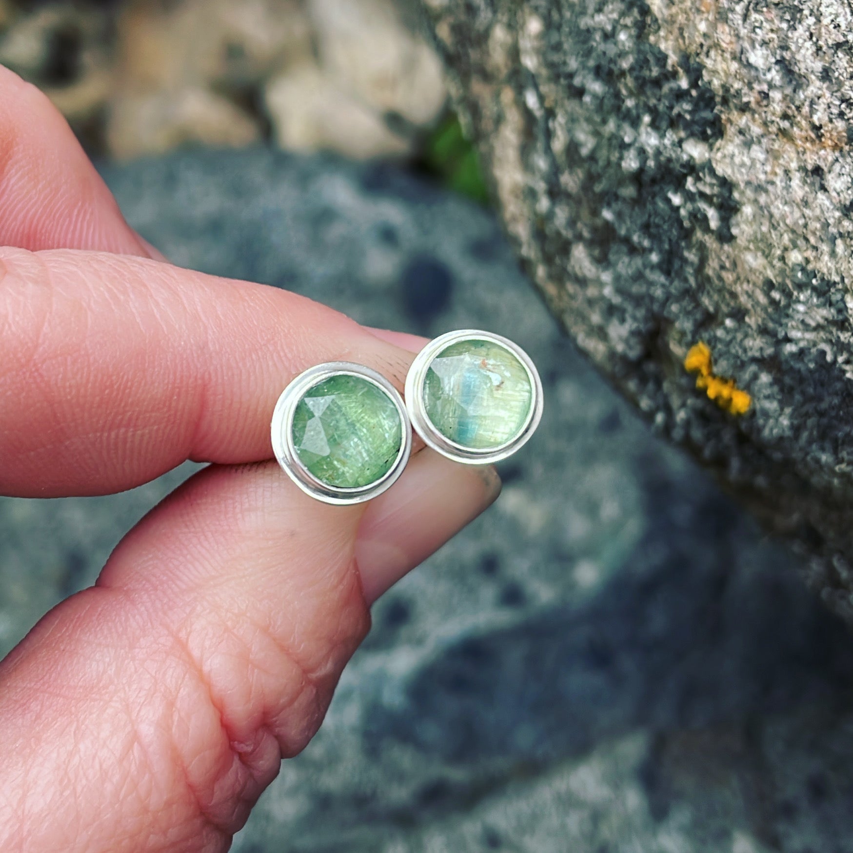 Blue green faceted kyanite and sterling silver post earrings. Approximate dimensions are 7/16" x 7/16". Post is 1/2"L.