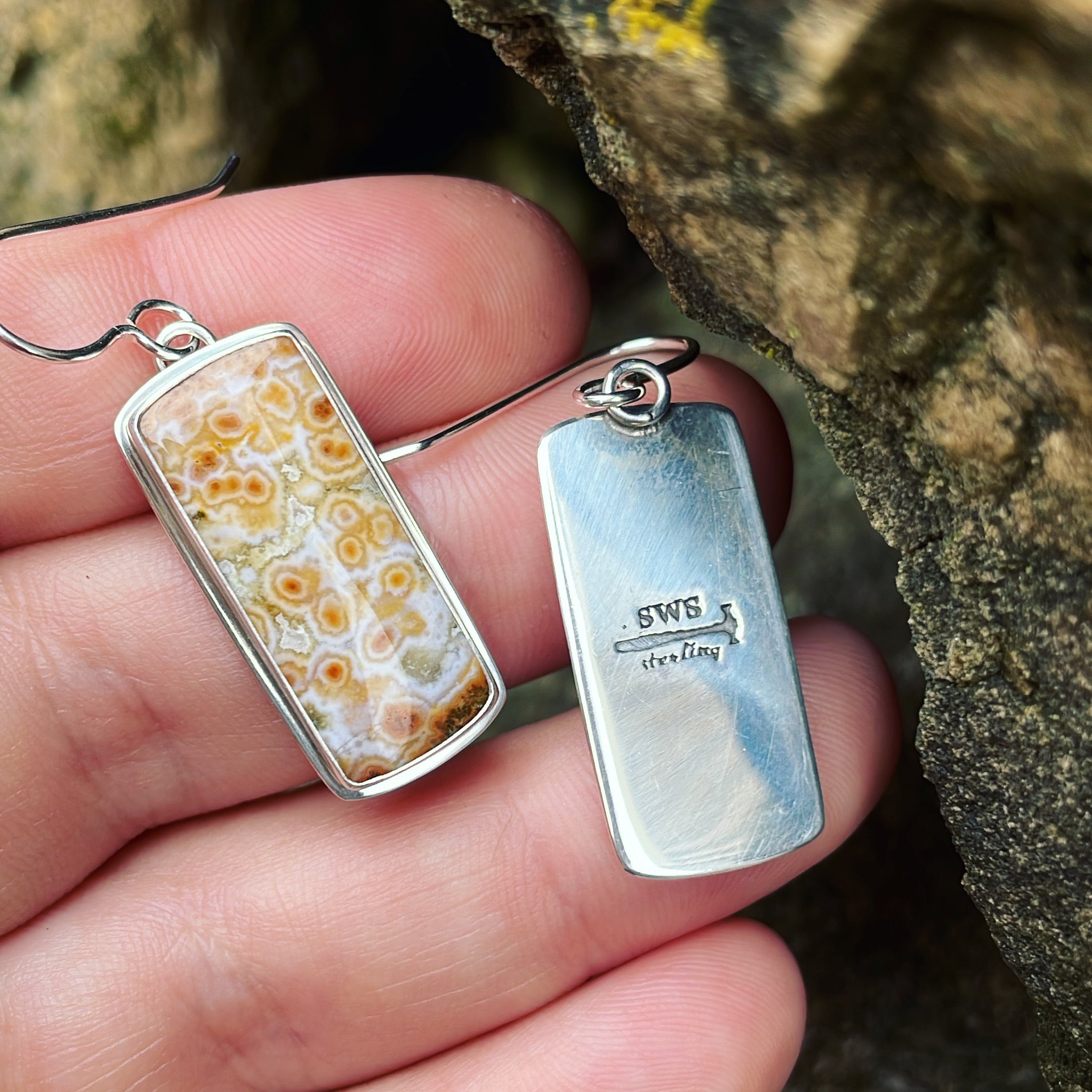 Orbicular Jasper (Madagascar) and sterling silver earrings. Approximate dimensions are 1"L x 1/2"W.
