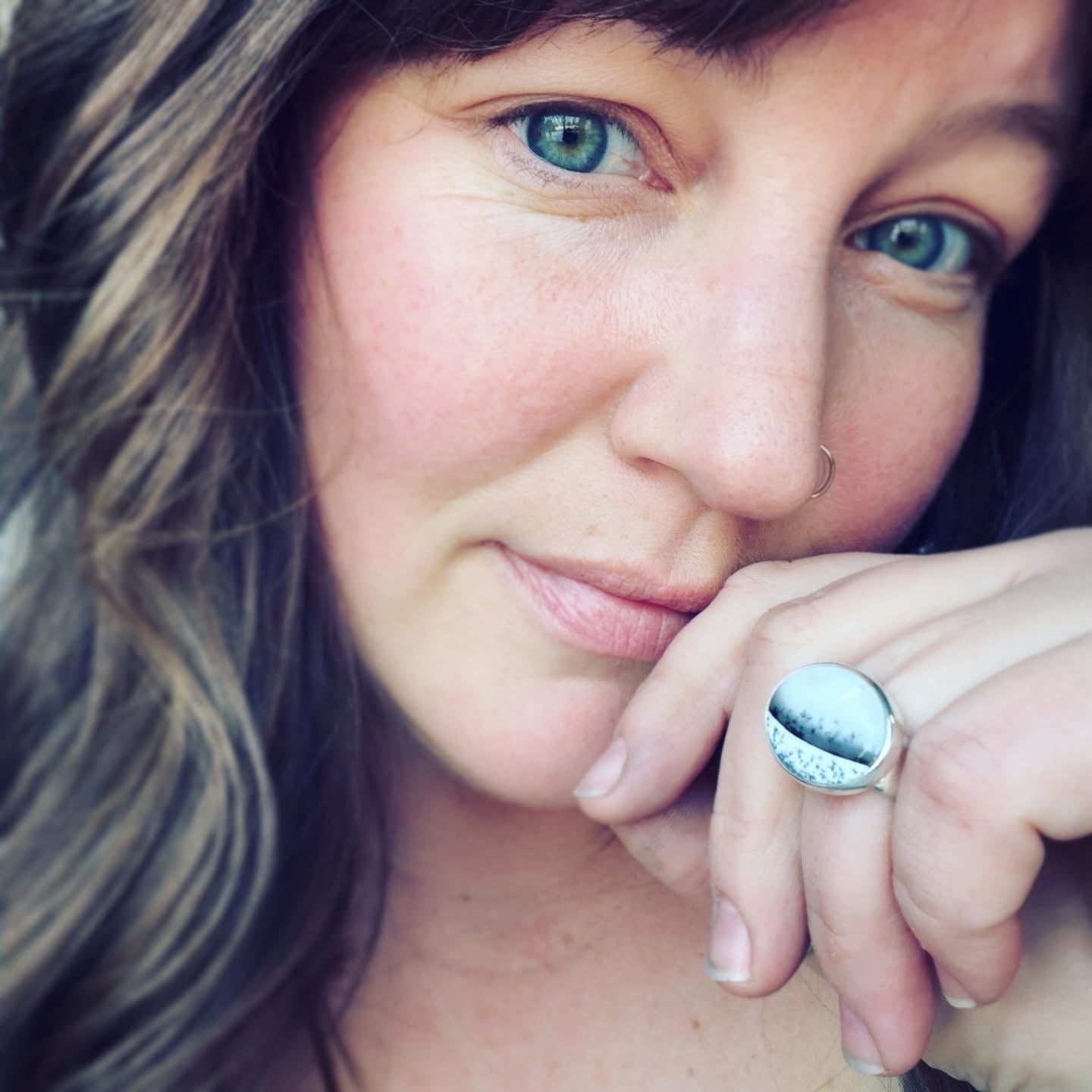 Snow bowl chalcedony (dendritic agate) and sterling silver ring.  Approximate dimensions are 7/8"W x 5/8"L. Current ring size is a 7-1/2.