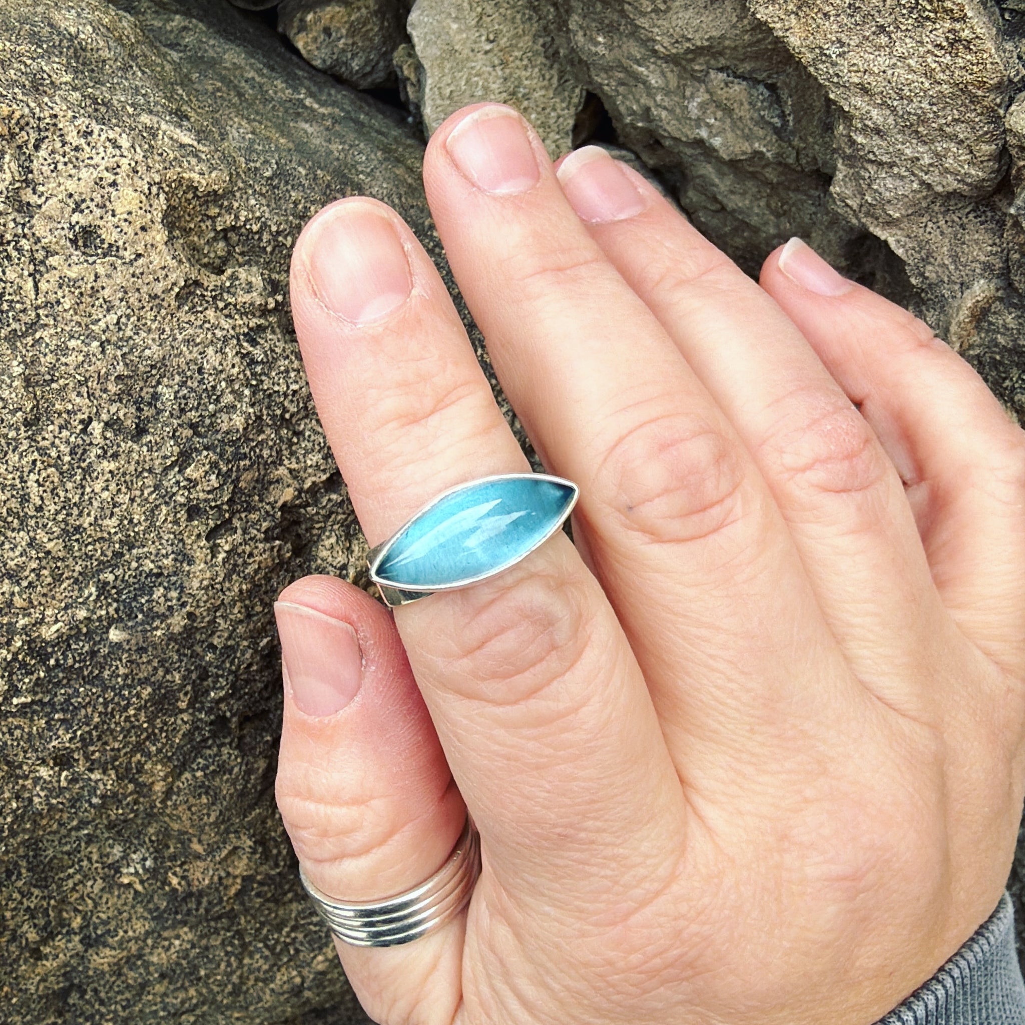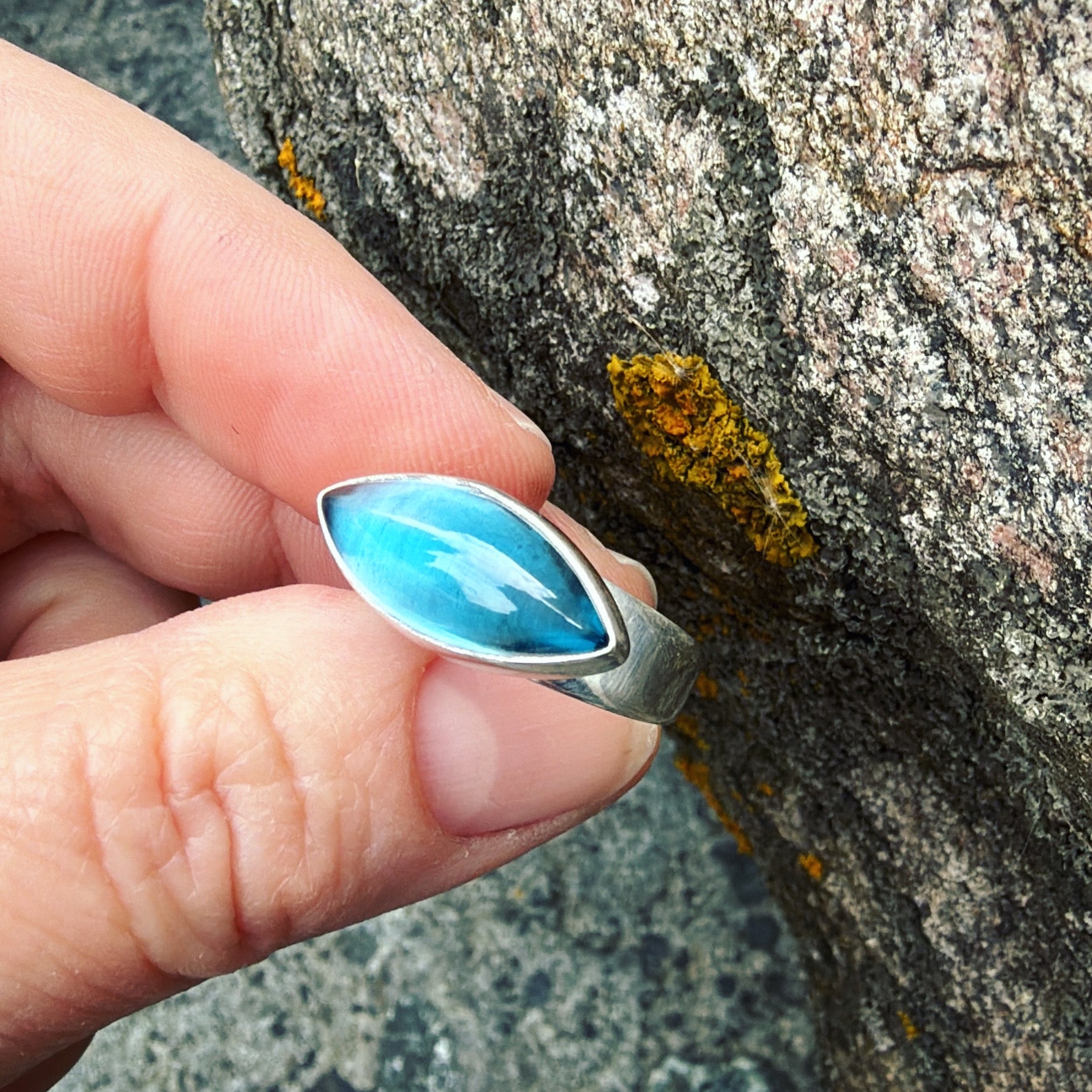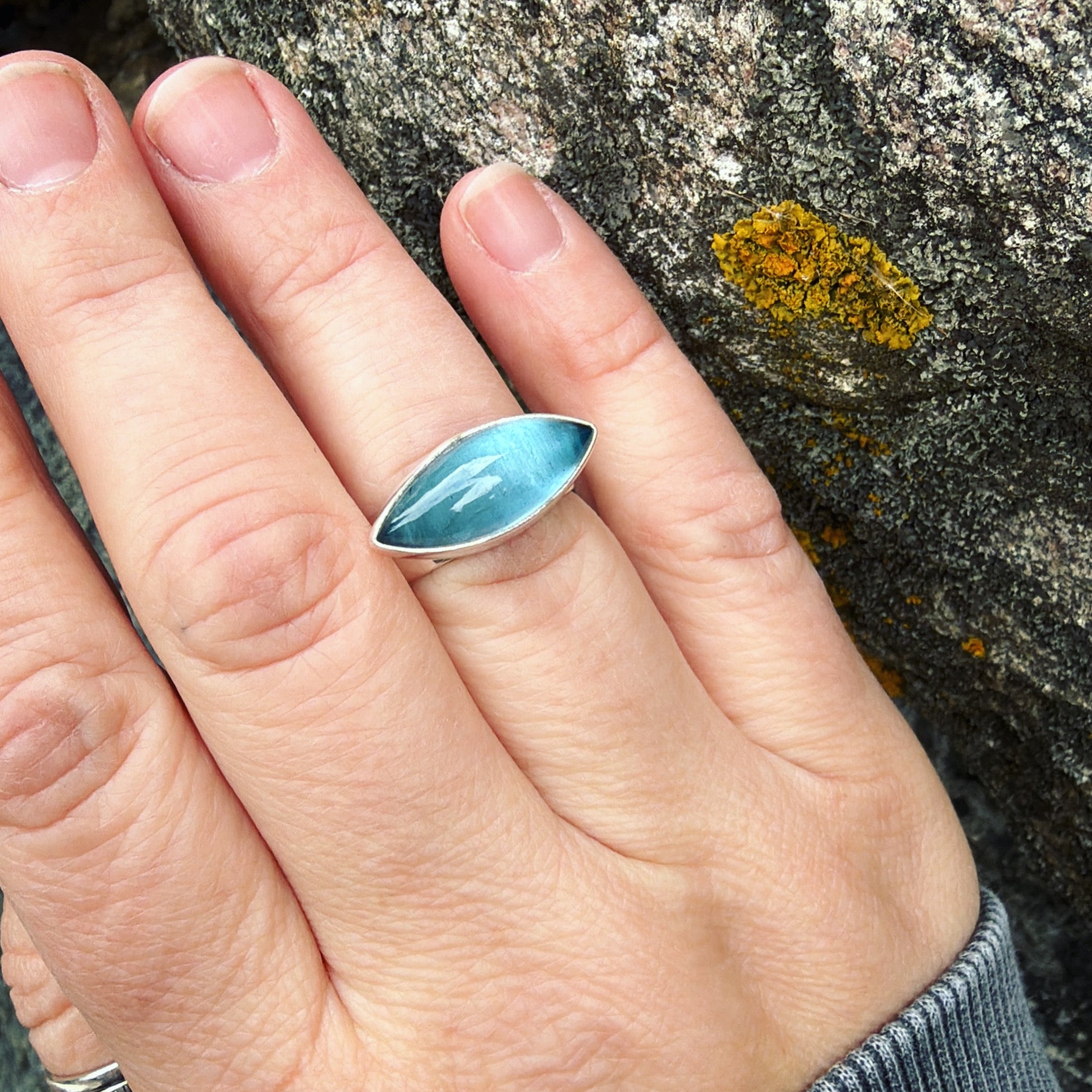 Blue topaz and sterling silver ring. Approximate dimensions are 7/8"W x 3/8"L. Current ring size is a size 7-1/2.