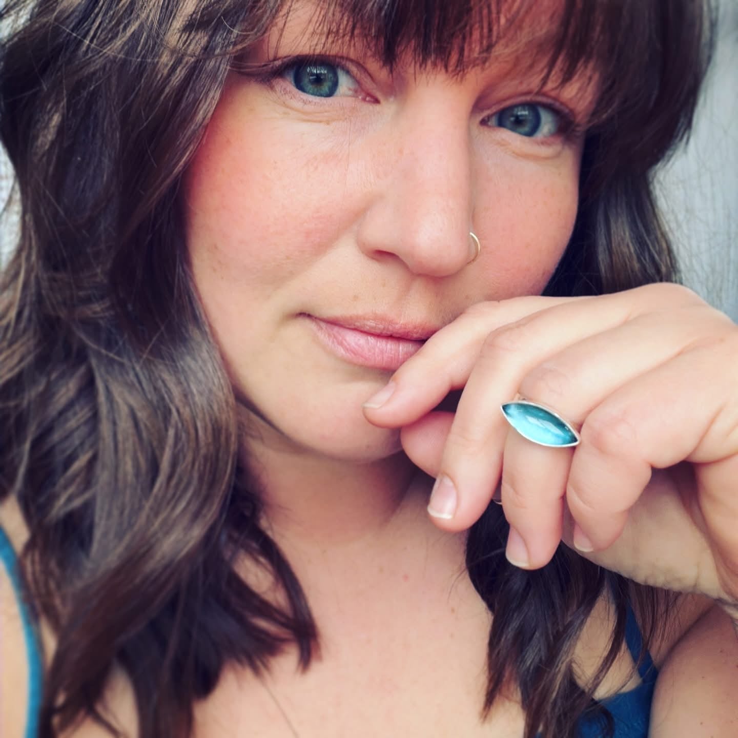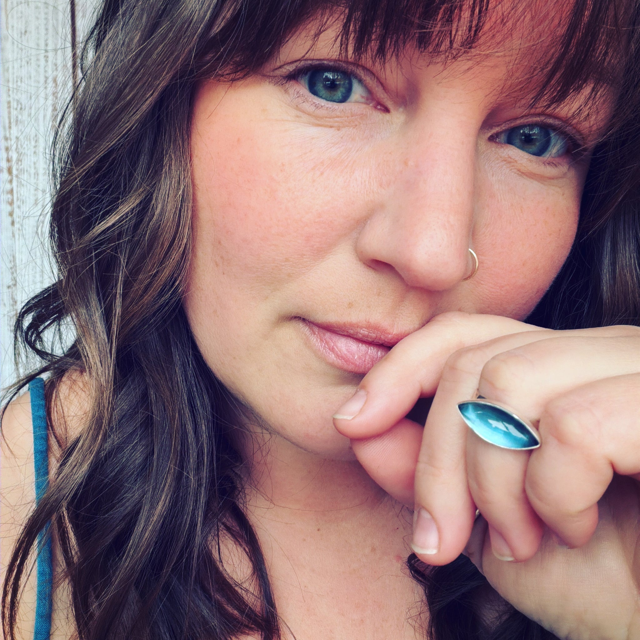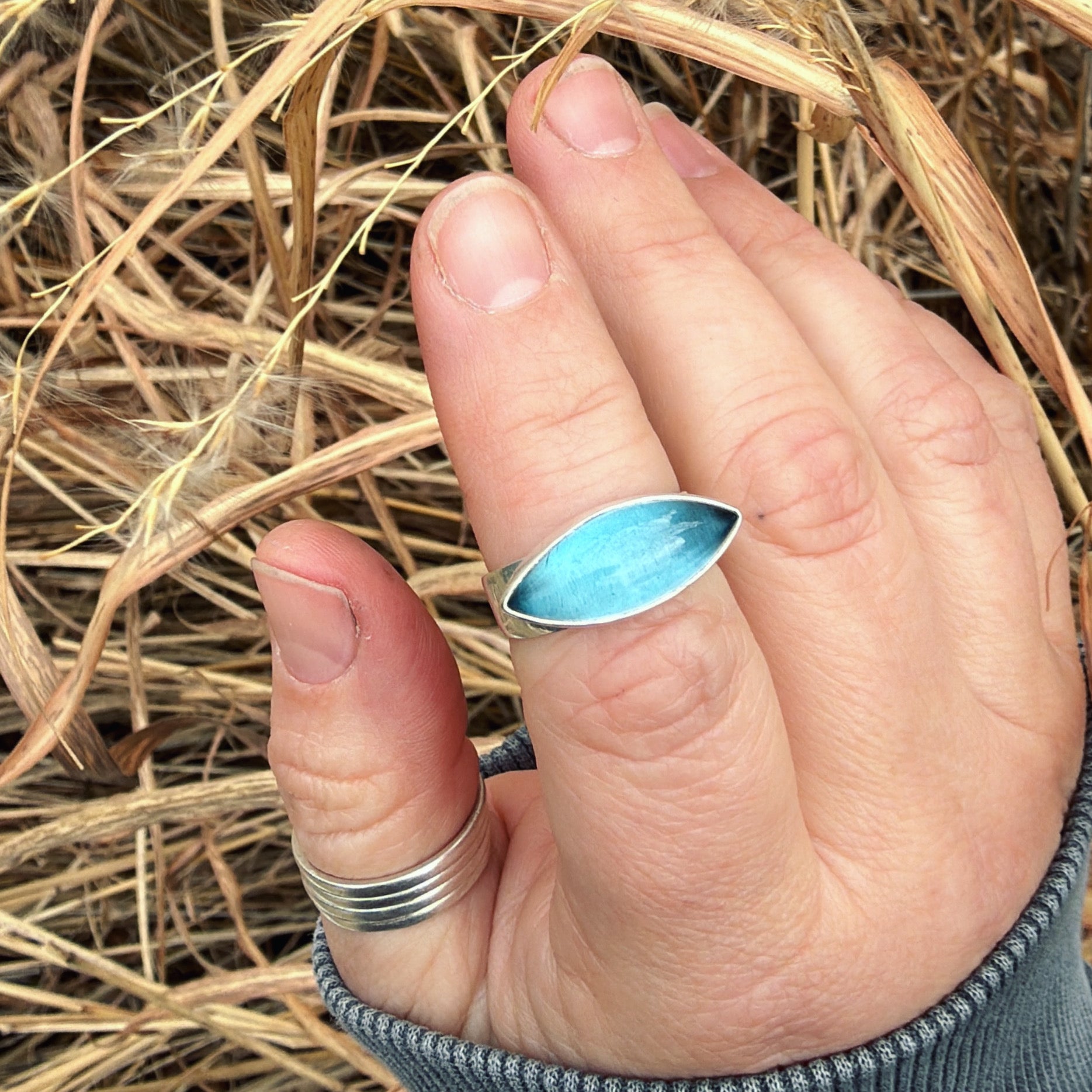 Blue topaz and sterling silver ring. Approximate dimensions are 7/8"W x 3/8"L. Current ring size is a size 7-1/2.