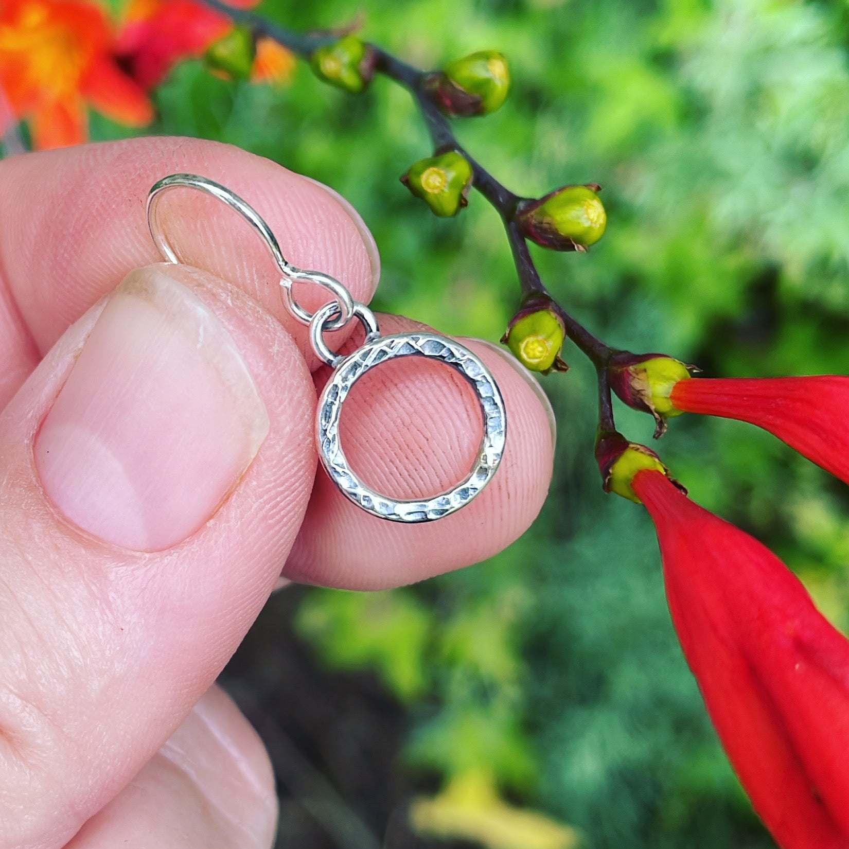Sterling silver small textured and oxidized circles. Approximate diameter is 7/16", earring length is 1/2"L.